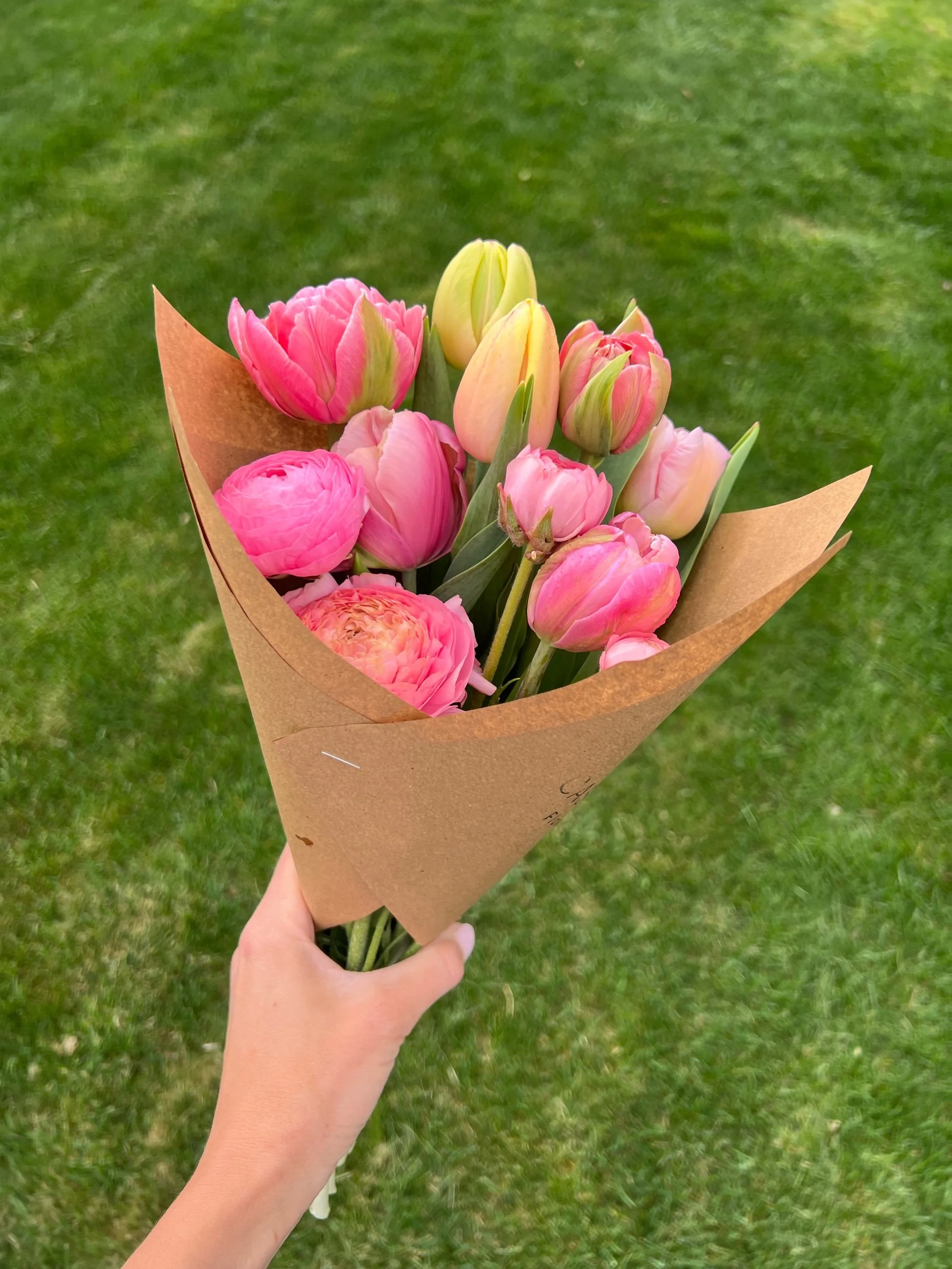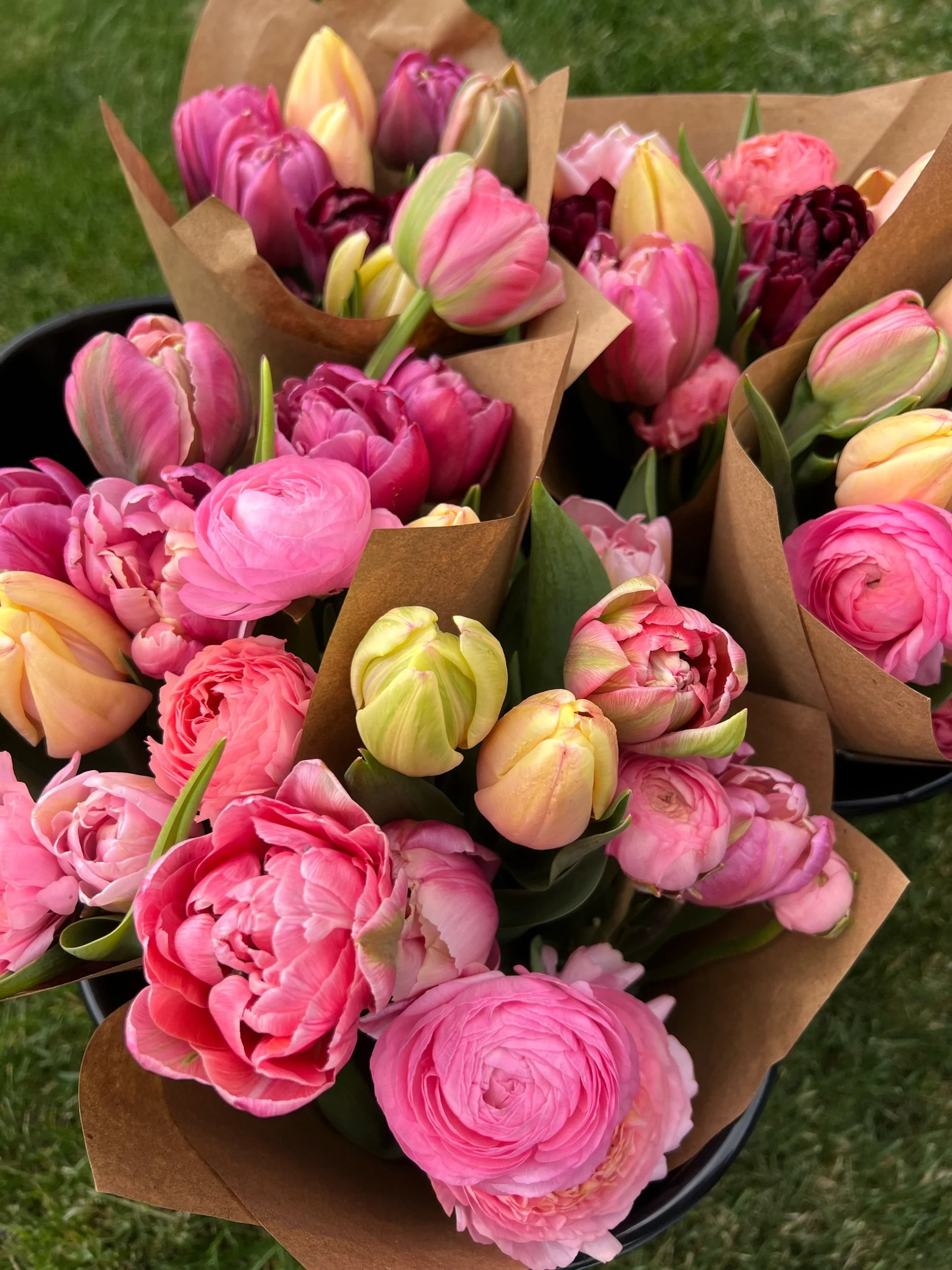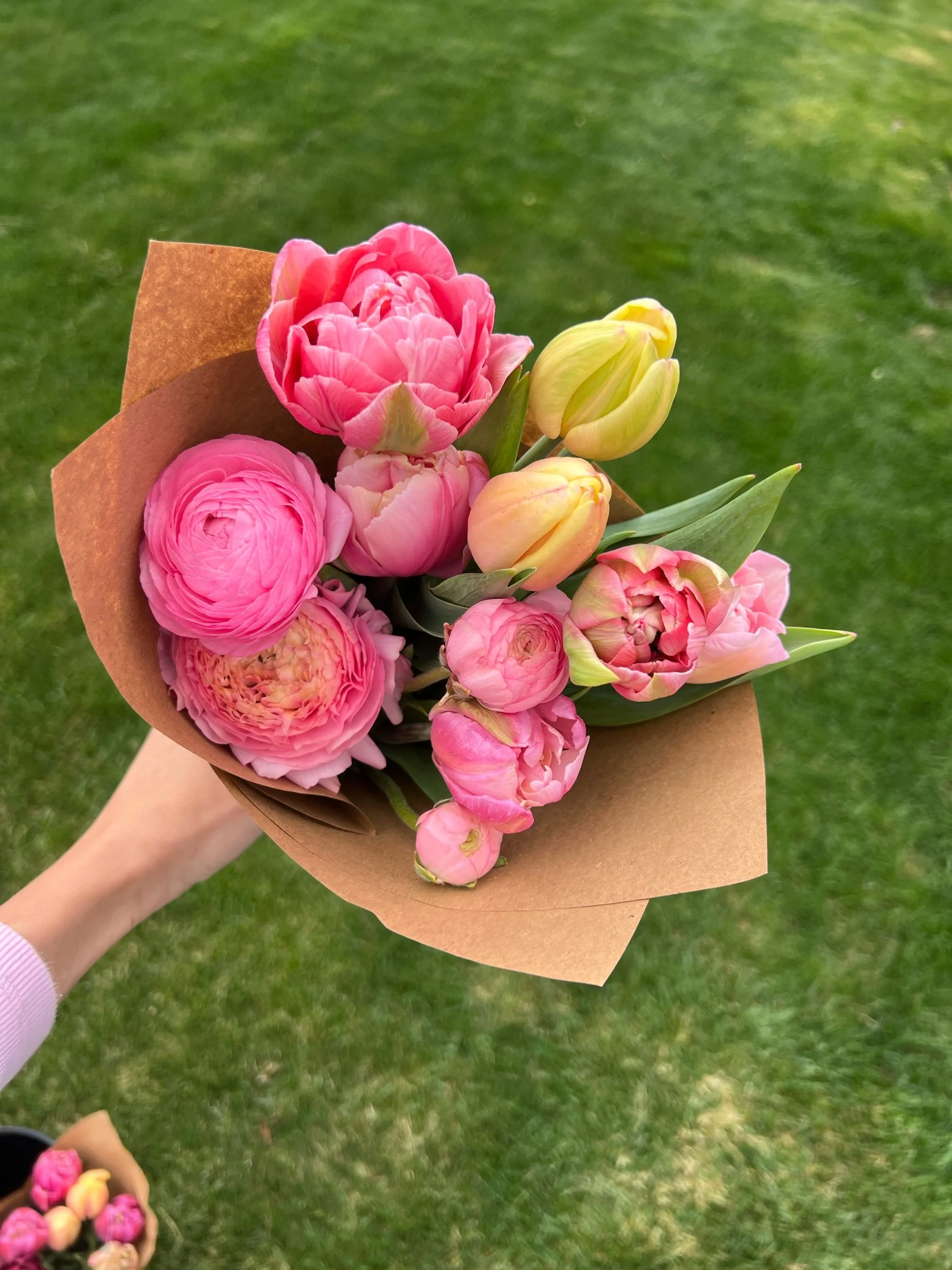 This week’s bouquet features peony style tulips, light pink, pink and yellow and a ranunculus.